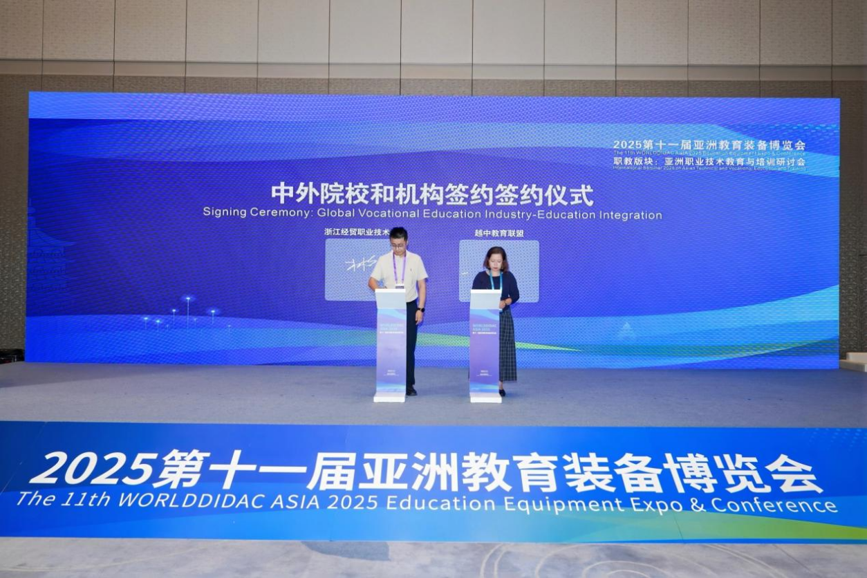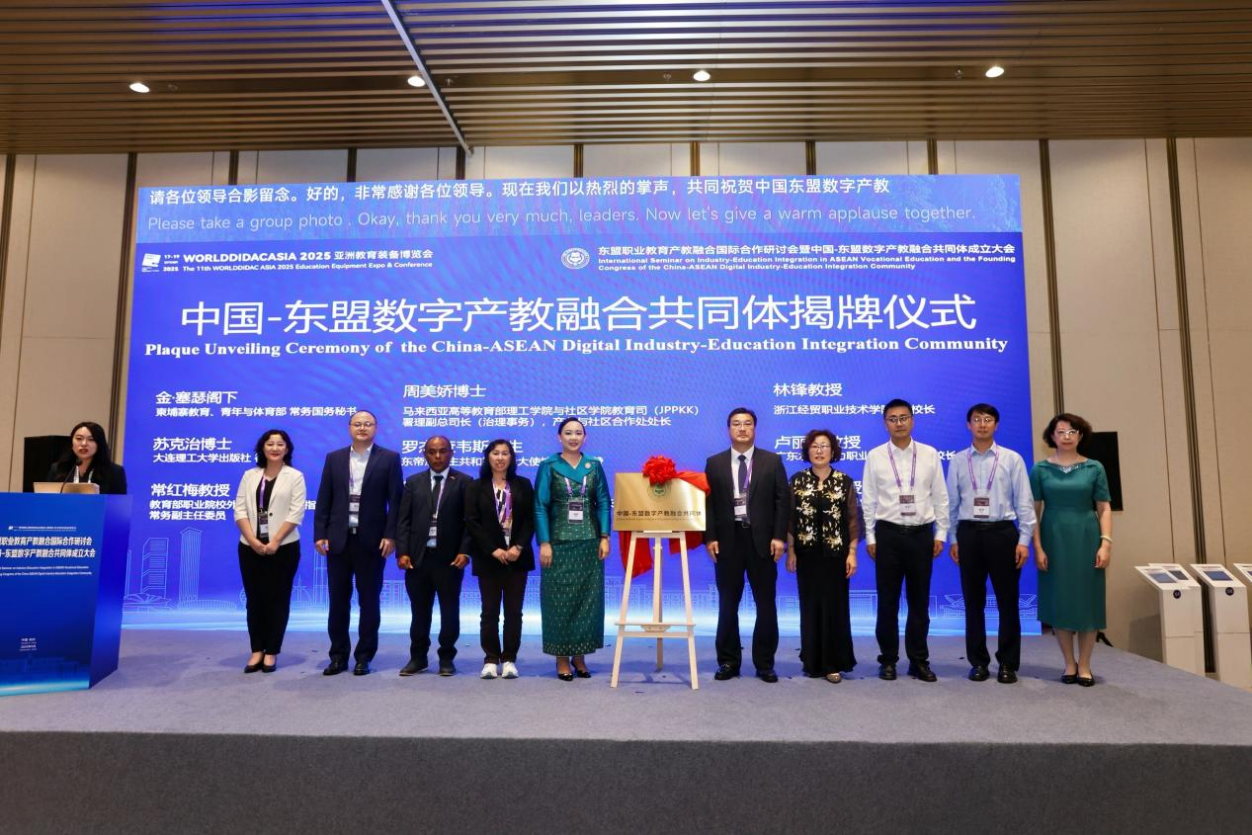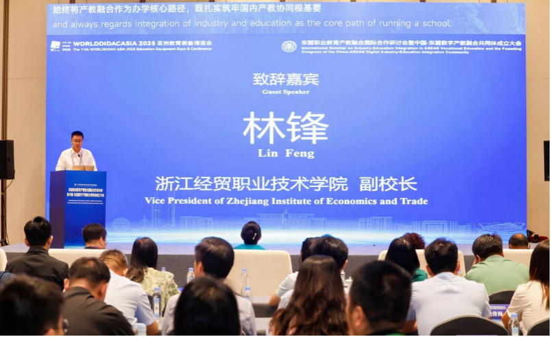 近日,由我校和大连理工大学出版社、博鳌职业教育发展大会组委会共同主办的2025东盟职业教育产教融合国际合作研讨会暨中国一东盟数字产教融合共同体成立大会在杭州大会展中心成功举行。此次会议共邀请柬埔寨、马来西亚、越南、东帝汶等东盟国家,以及国内近40余家院校、企业负责人、教师代表200余人参加会议。学校副校长林锋出席会议并致辞。学校国际教育学院、国际交流与合作中心负责人及商务智能学院相关教师代表参加会议。
