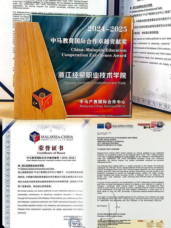 在扎希德副总理的见证下,学校凭借在中马职业教育合作中的积极贡献和育人成效,获颁“中马教育国际合作卓越贡献奖(2024-2025)”,和中马产教国际合作中心签发的荣誉证书和感谢信。
