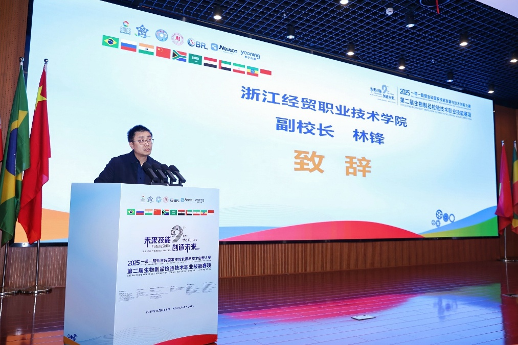 11月6日下午举行开幕式。金砖国家技能发展与技术创新大赛组委会执委会主席刘振英作视频致辞。中国生物工程学会秘书长、全国生物技术行指委常务副主任兼秘书长张宏翔,学校党委委员、副校长林峰出席活动并致辞。参赛选手代表、我校学生翟妍彬和大赛裁判长、山东职业学院生物工程学院院长吕映辉分别代表选手和裁判宣誓。与会嘉宾共同按下手印,正式宣告大赛开幕。