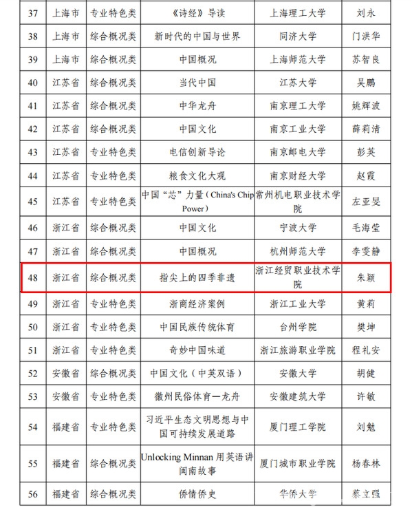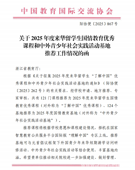 近日,教育部中国教育国际交流协会正式发布了2025年度来华留学生“了解中国”优秀课程。经学校申请、省教育厅推荐、全国专家审核,我校申报的“指尖上的四季非遗”成功入选。浙江省高校共有6门课程入选,其中高职院校仅2门。